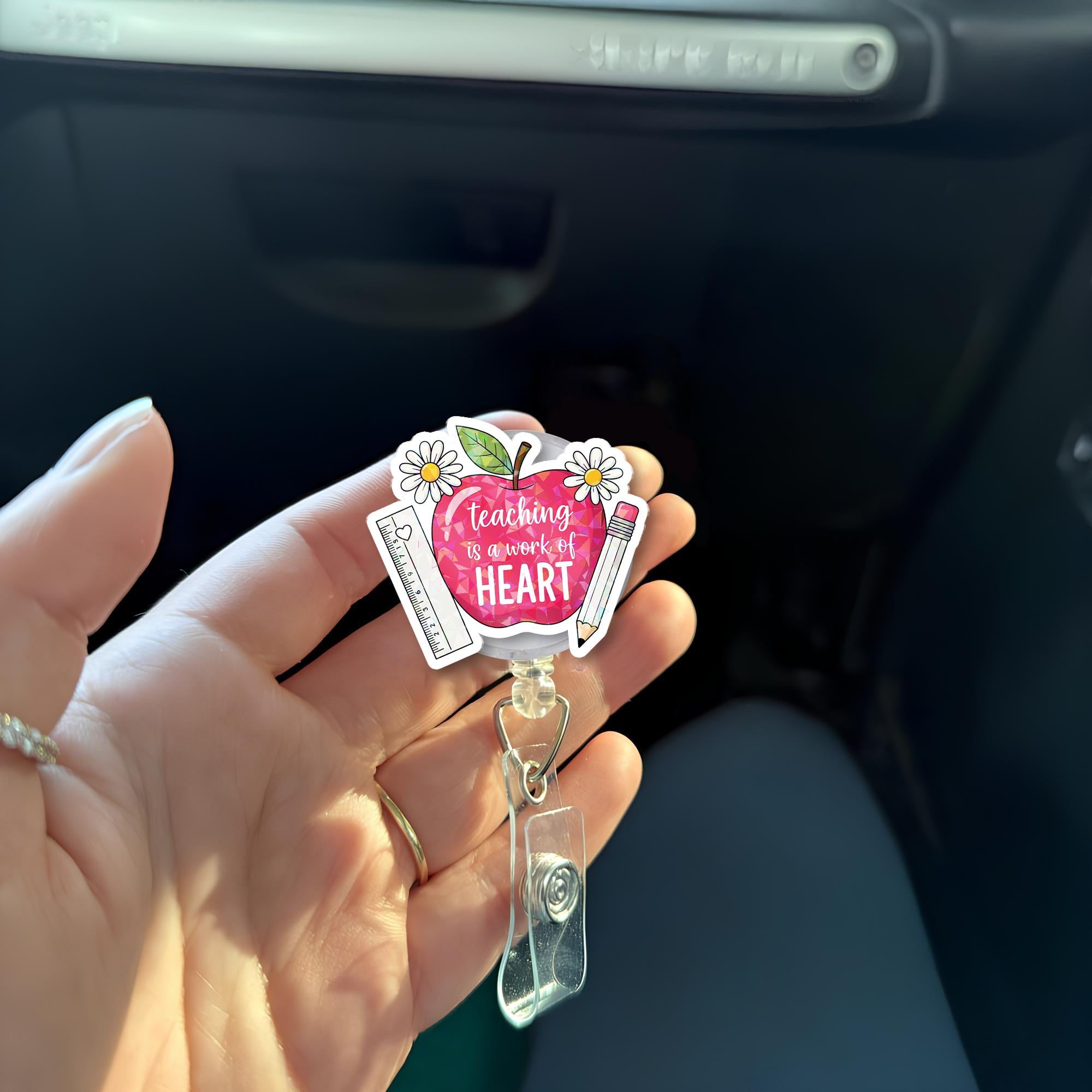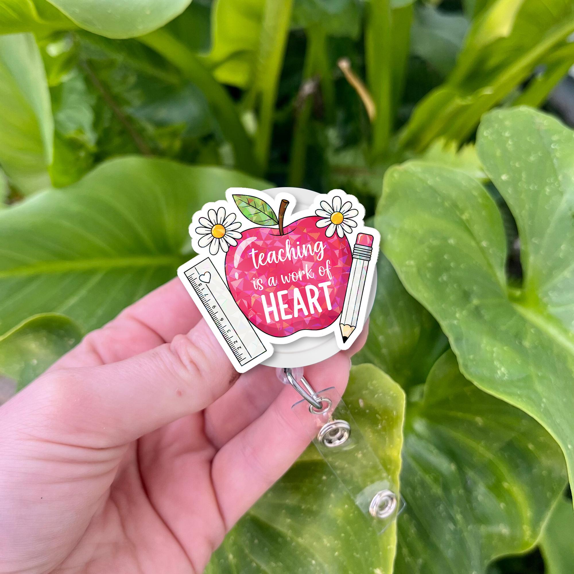 Teaching Is a Work of Heart Badge Reel | Cute Teacher ID Holder | Back to School Teacher Gift | Apple Pencil Daisy Design