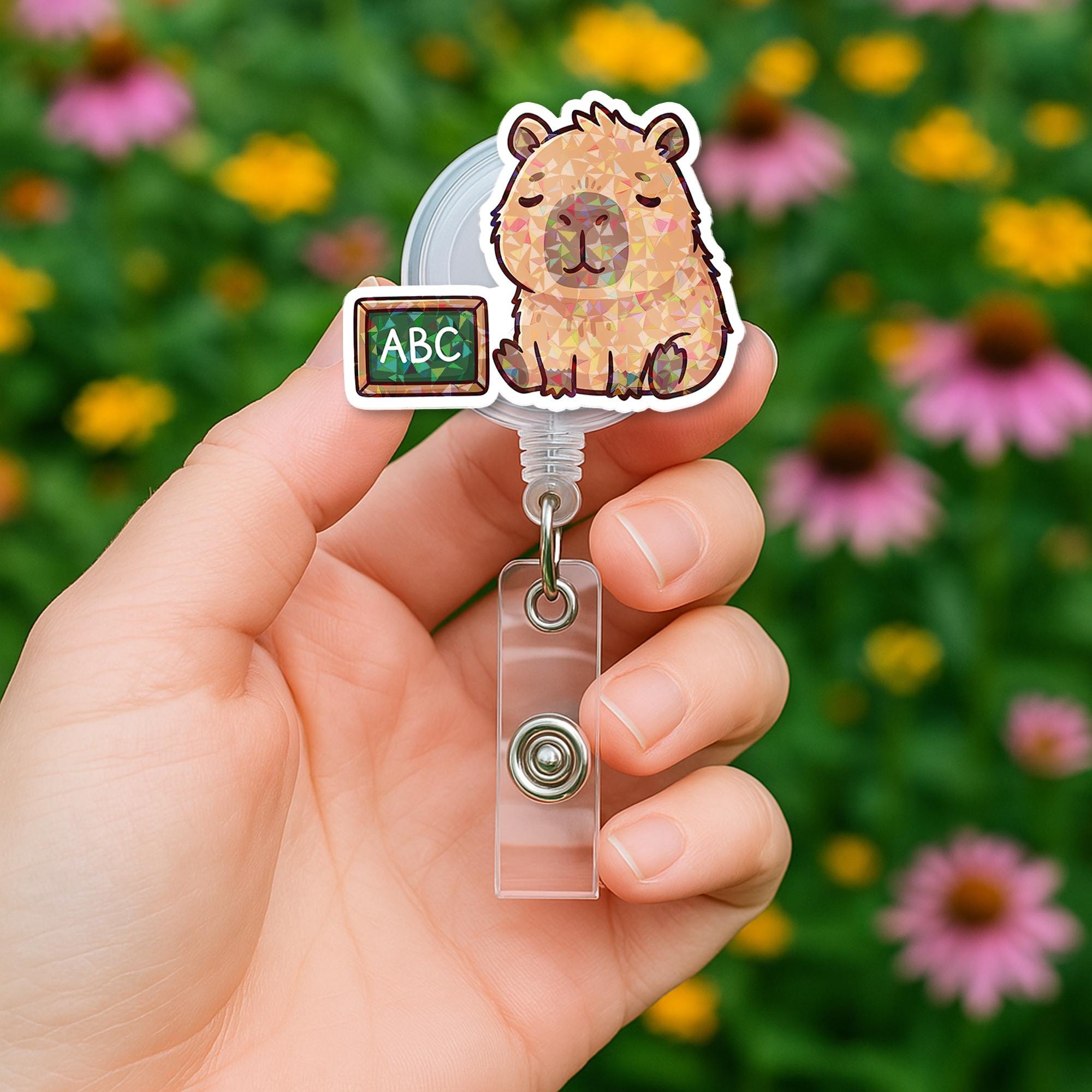 Capybara Teacher Badge Reel | Cute Animal ID Holder | ABC Chalkboard Clip | Retractable Reel for Back to School | Teacher Gift Idea