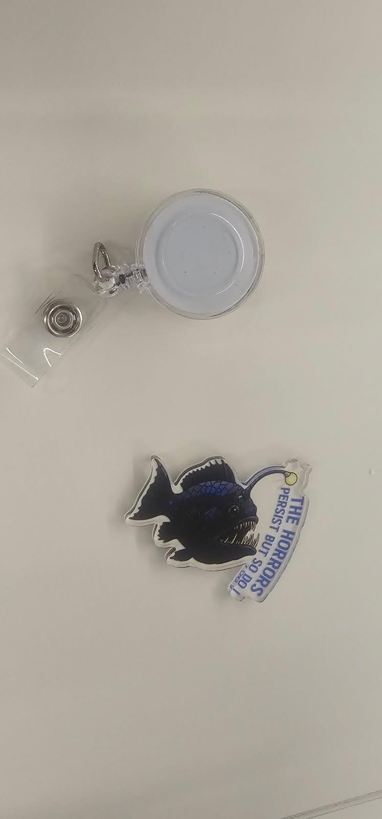 Anglerfish Horrors Persist But So Do I Badge Reel, Black Sead evil Fishing Gen z inspired, She Rises, deep sea fish badge reel