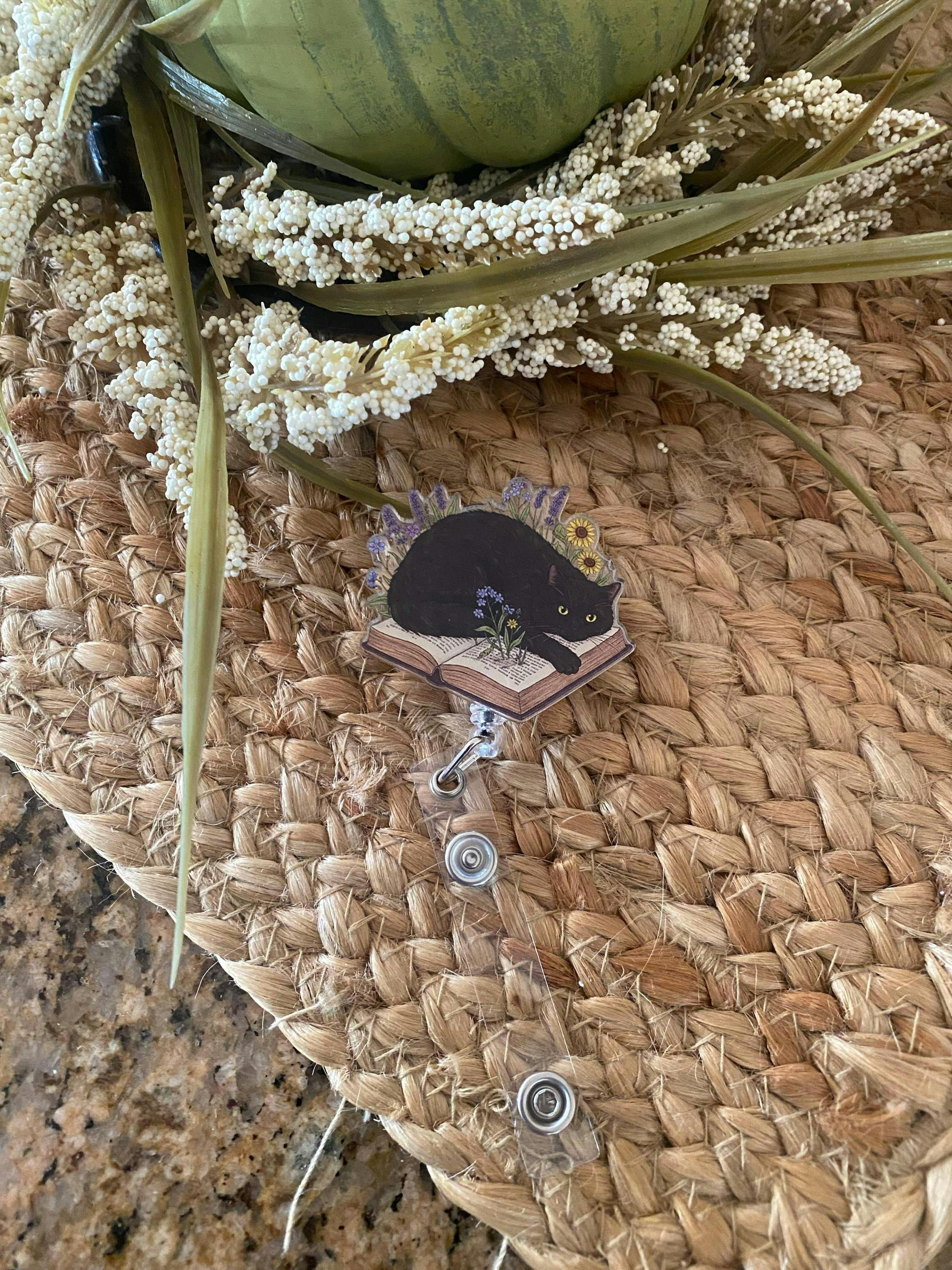 Black cat and book Badge Reel, Bookish badge reel, cute cat mom id holder, reading lover idea gift, black cat mom badge reel