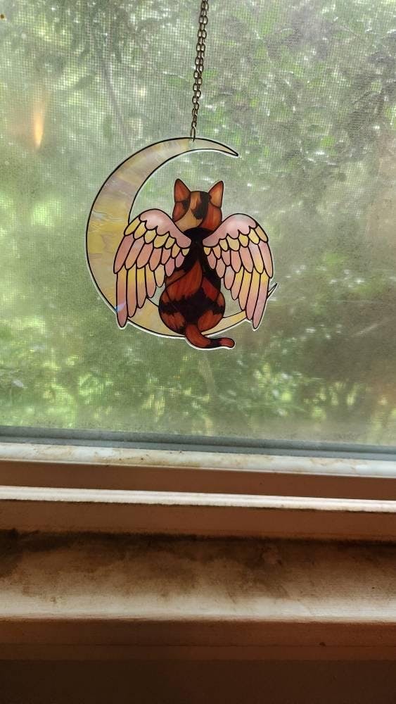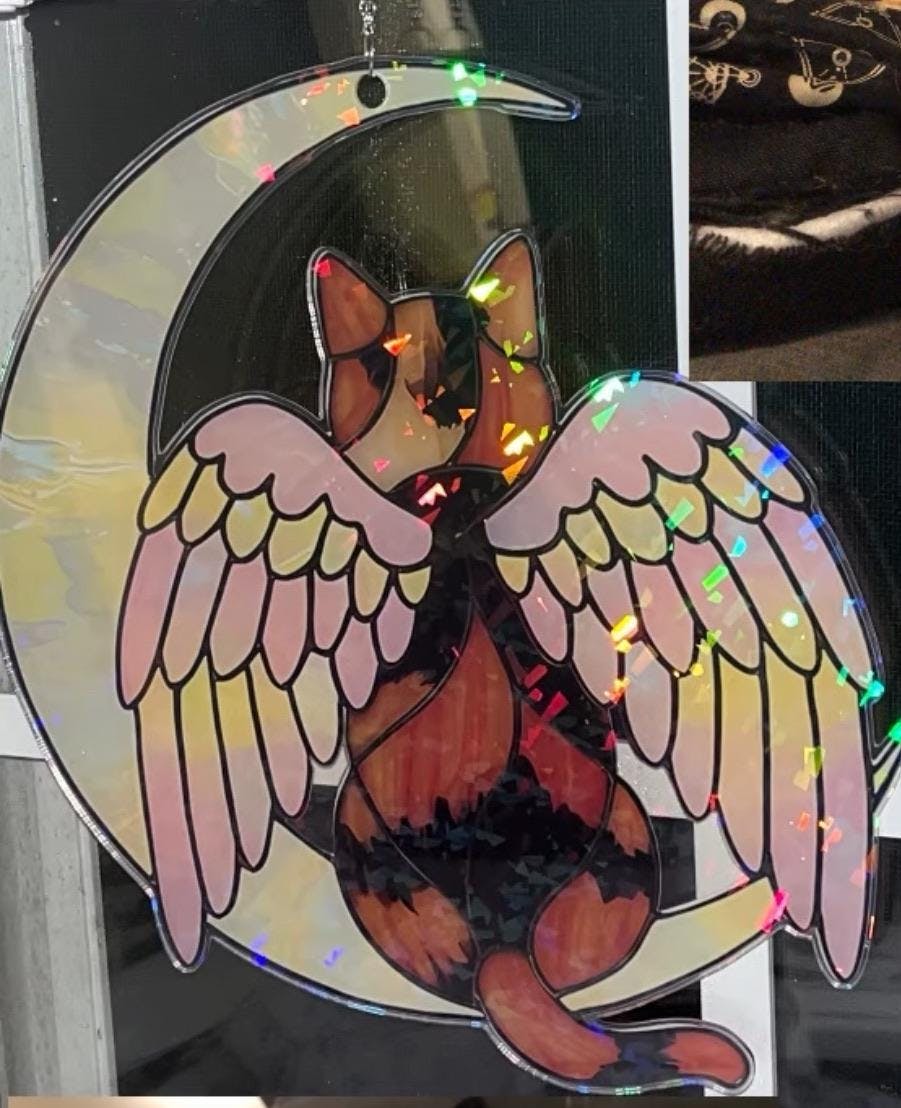 Calico Cat Angel Decor, Holographic Acrylic Window Hanging, Cat Memorial Gift, Pet Loss Keepsake, Moon and Wings Ornament, Calico Cat Mom