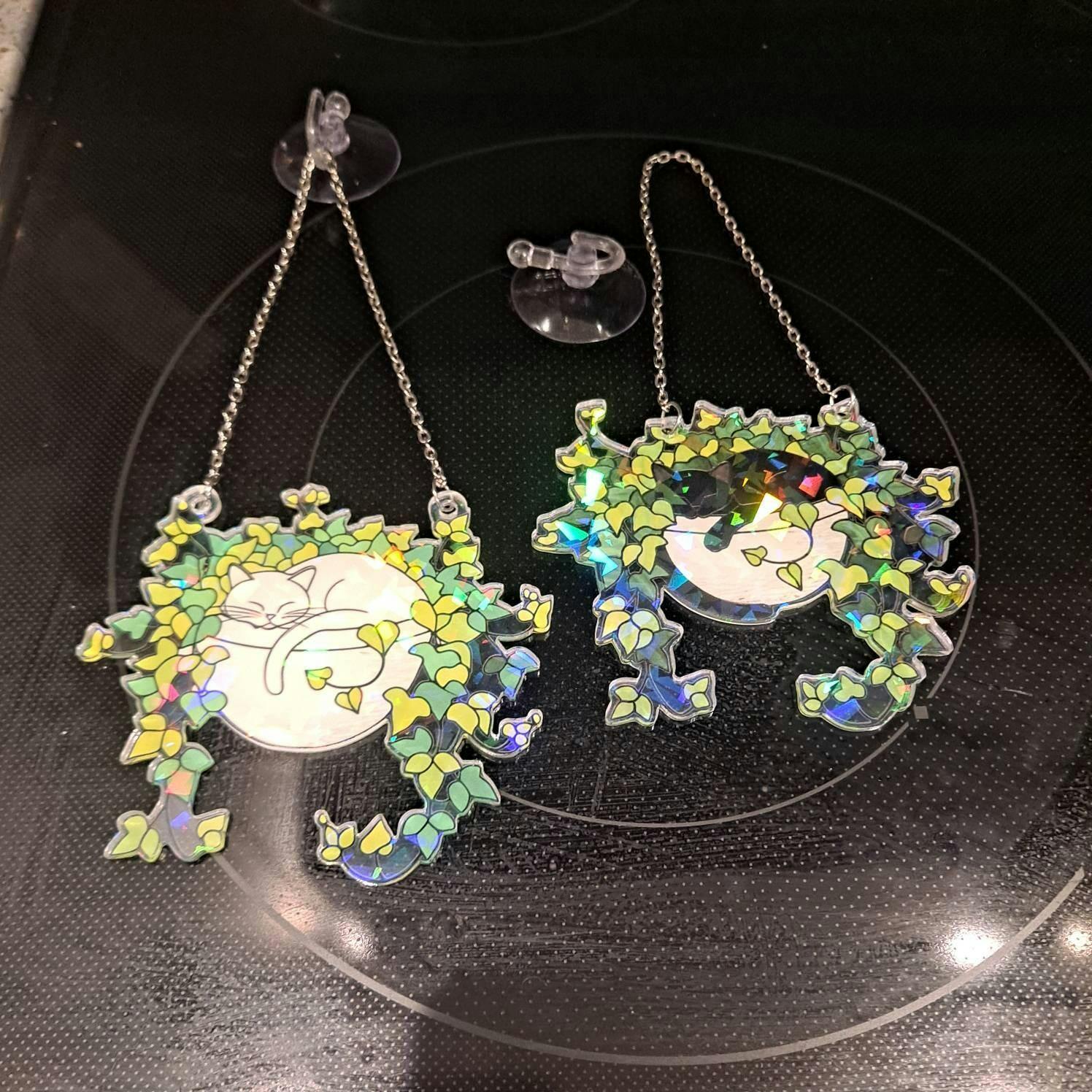 White Cat Sleeping on Ivy Hologram Ornament | Cat ACRYLIC Window Hanging | Plant Lover Gift | Ivy Plants Decor, Cozy Cat Decor, Gift For Mom