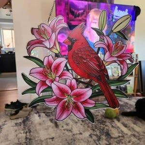 Cardinal and Lily Window Hanging, Holographic Acrylic Suncatcher, Red Bird Floral Decor, Stargazer Memorial Gift,Bird Lover Gift,Floral Bird