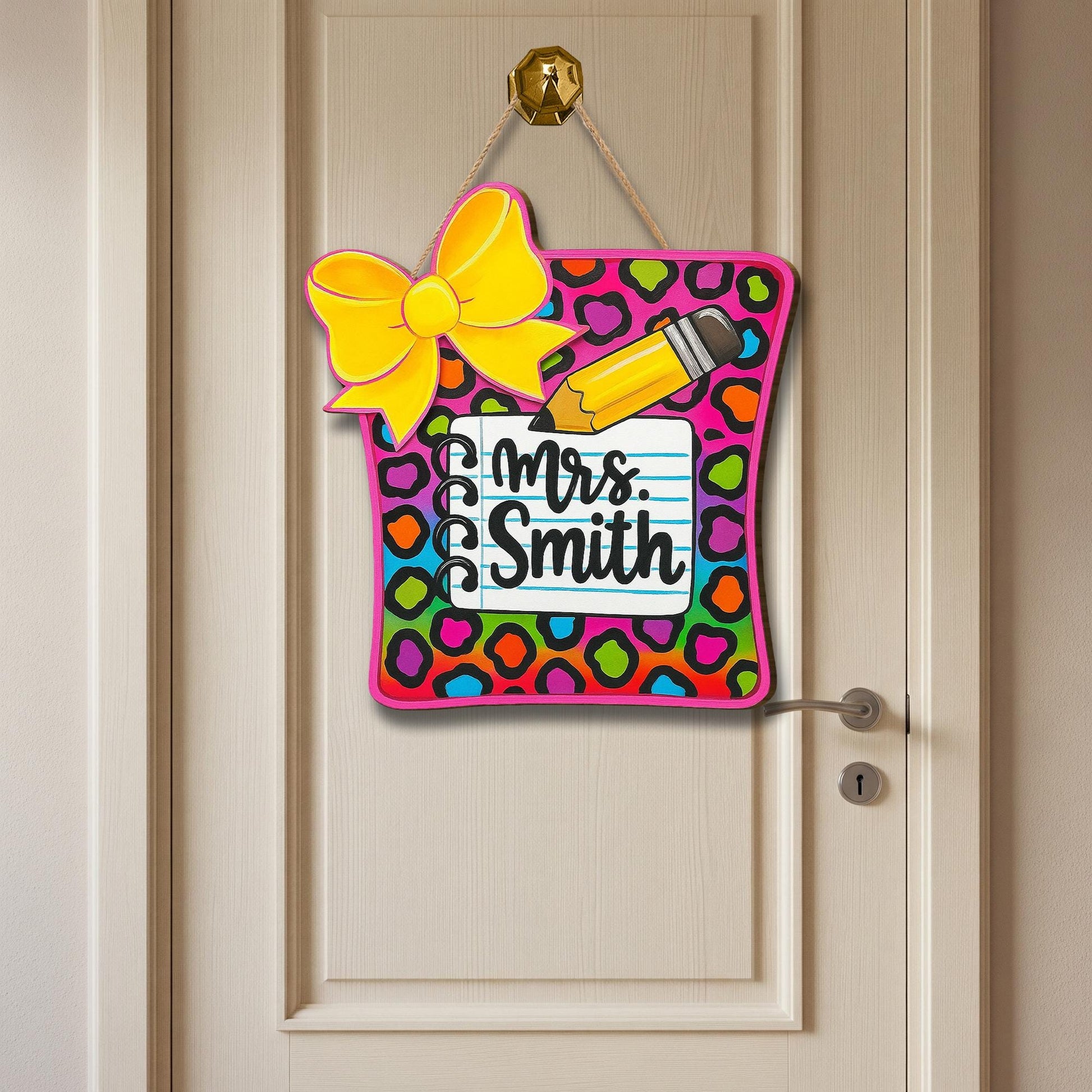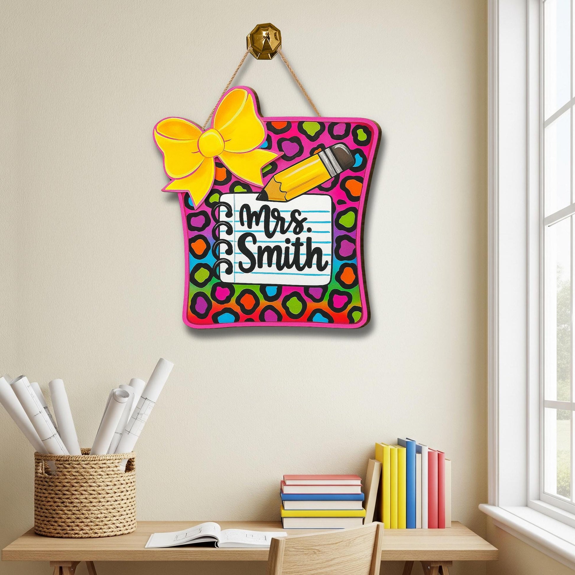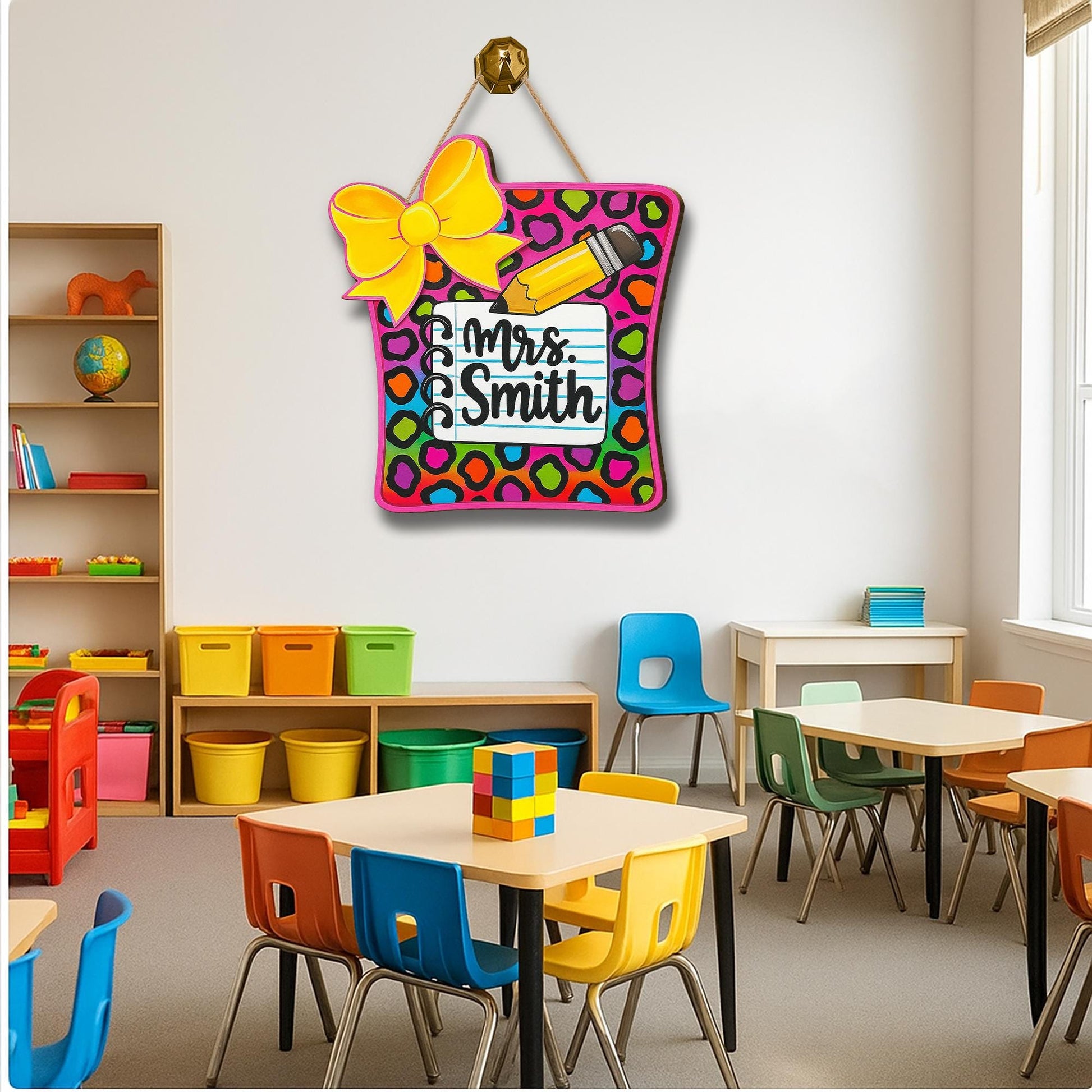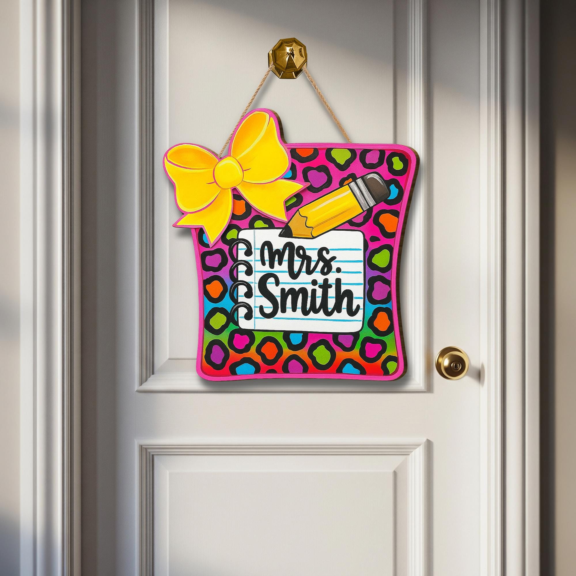 Personalized Teacher Door Hanger, Teacher Door Sign with Pencil, Bow & Leopard Print, Classroom Decor for Back to School, School Sign Hanger