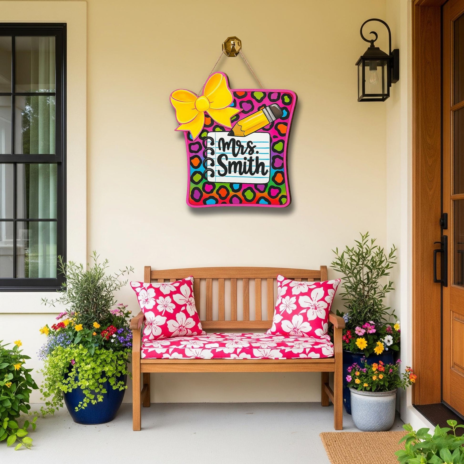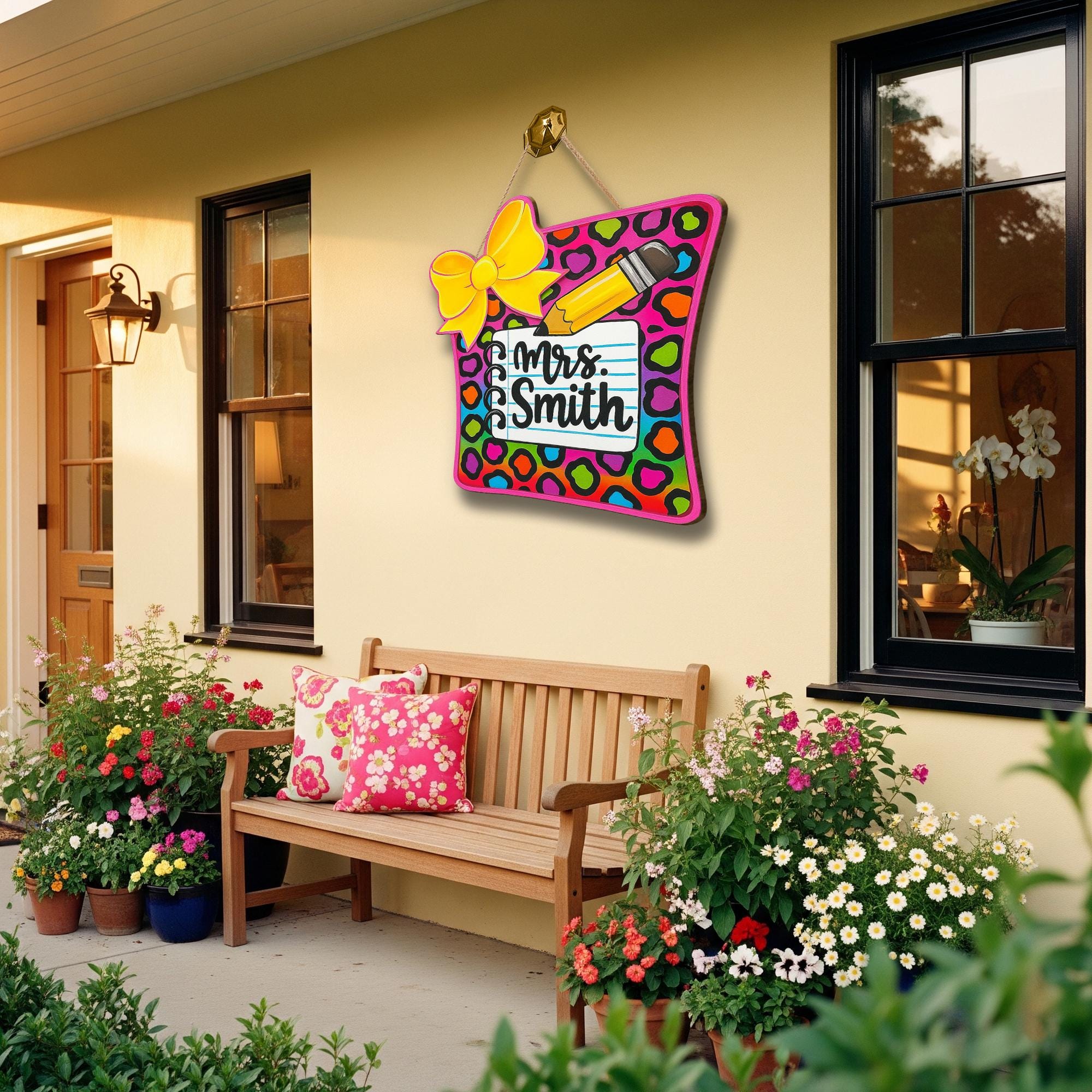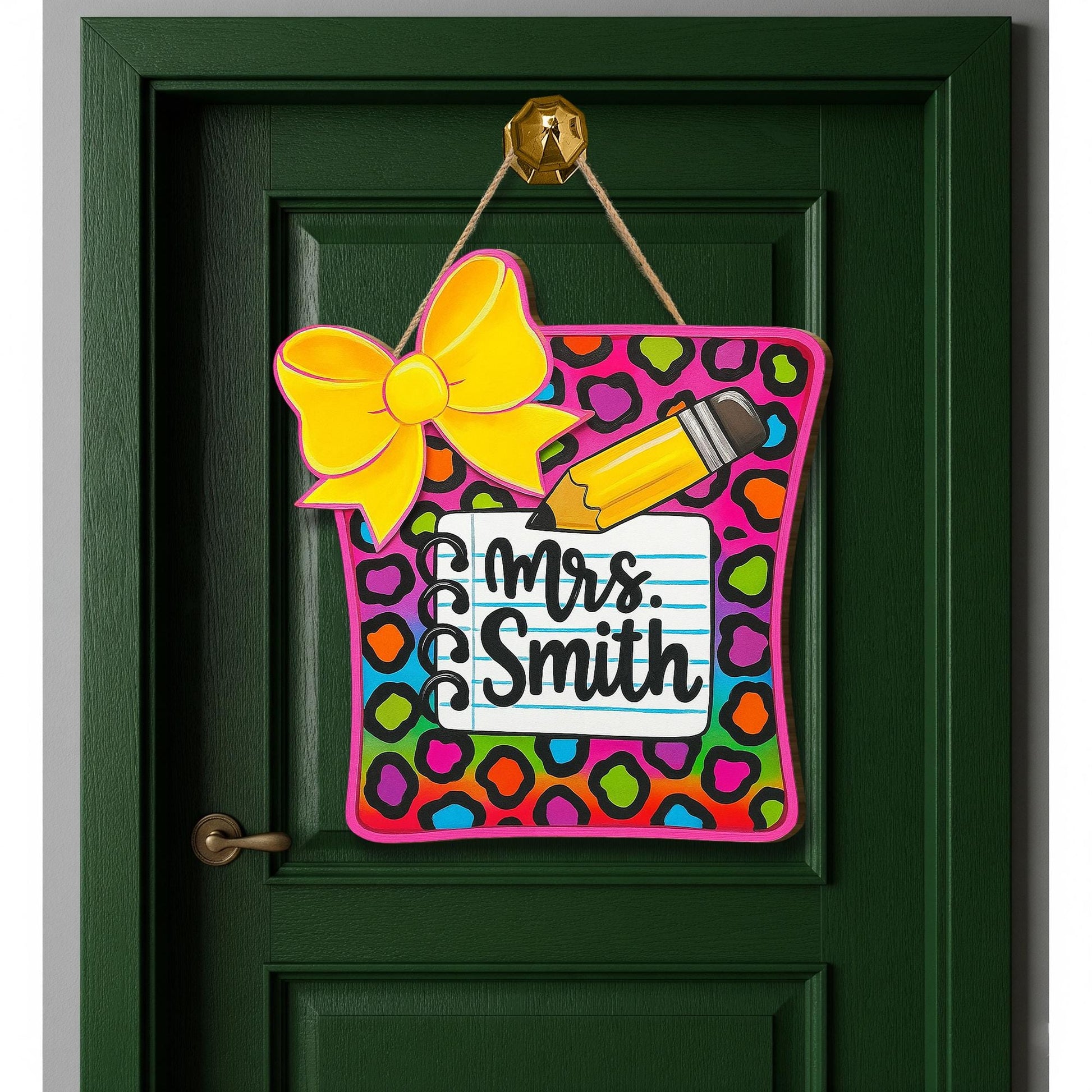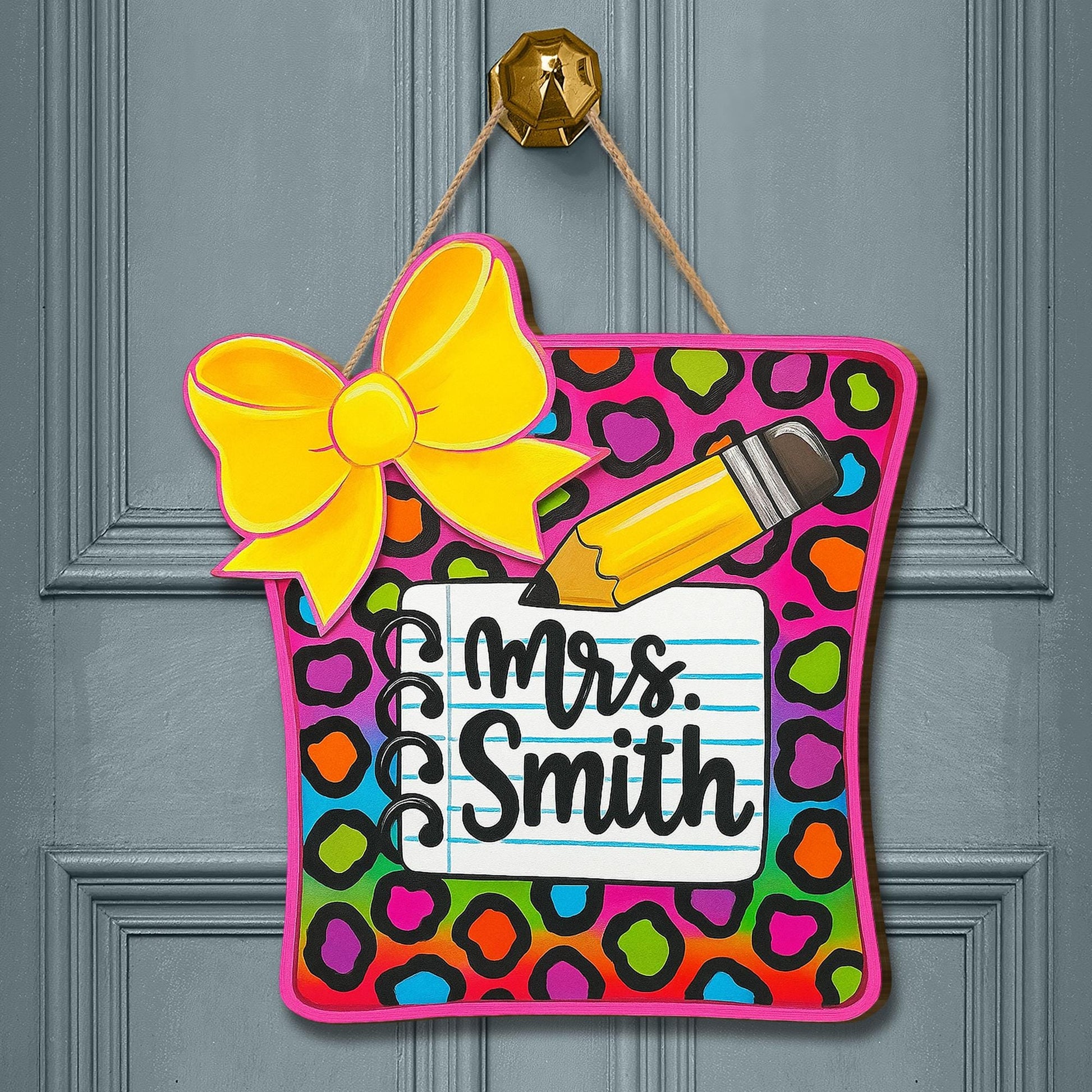 Personalized Teacher Door Hanger, Teacher Door Sign with Pencil, Bow & Leopard Print, Classroom Decor for Back to School, School Sign Hanger