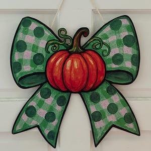 Pumpkin Bow Door Hanger, Fall Blue Gingham Wooden Sign, Autumn Porch Decor, Farmhouse Thanksgiving Wall Hanging, Rustic Fall Accent