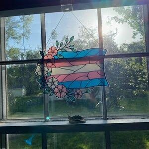 Trans Pride Acrylic Window Hanging – Floral Transgender Flag Suncatcher, LGBTQ+ Window Decor, Inclusive Pride Gift for Home